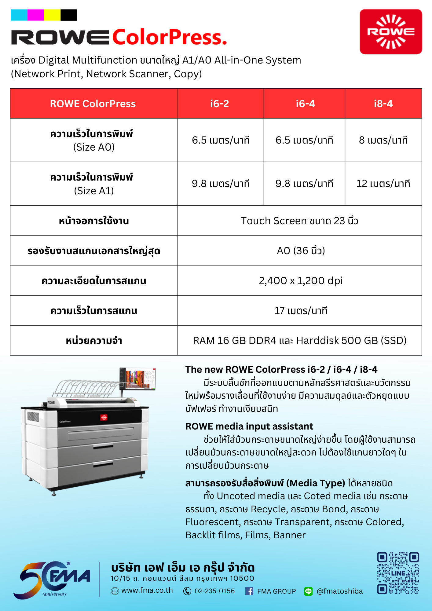ด้วยการออกแบบใหม่หมด ดึงดูดสายตา ดีไซน์ทันสมัย และคุณภาพสูง มาพร้อมโลโก้เรืองแสง ช่วยแสดงสถานะการทำงานของเครื่องพิมพ์ขนาดใหญ่ ซึ่งเป็นมิตรกับผู้ใช้งาน ROWE ColorPress ออกแบบมาเพื่อรองรับปริมาณการพิมพ์สูงสุด คุณภาพงานพิมพ์ยอดเยี่ยม ป้องกันเอกสาร ทนทานต่อแสง UV และกันน้ำ แม้เพียงใช้กับกระดาษก็ตาม โดดเด่นด้วยต้นทุนการพิมพ์ของ ROWE ColorPress เช่น ระบบที่ไม่ต้องใช้กระดาษพิเศษสำหรับการพิมพ์โปสเตอร์คุณภาพสูง และไม่จำเป็นต้องเปลี่ยนหัวพิมพ์ งานพิมพ์ทั้งหมดจะแห้งสนิท เหมาะต่อการพับออนไลน์ อีกทั้ง ROWE ColorPress สามารถยังต่อขยายอุปกรณ์ได้อย่างหลากหลายอีกด้วย